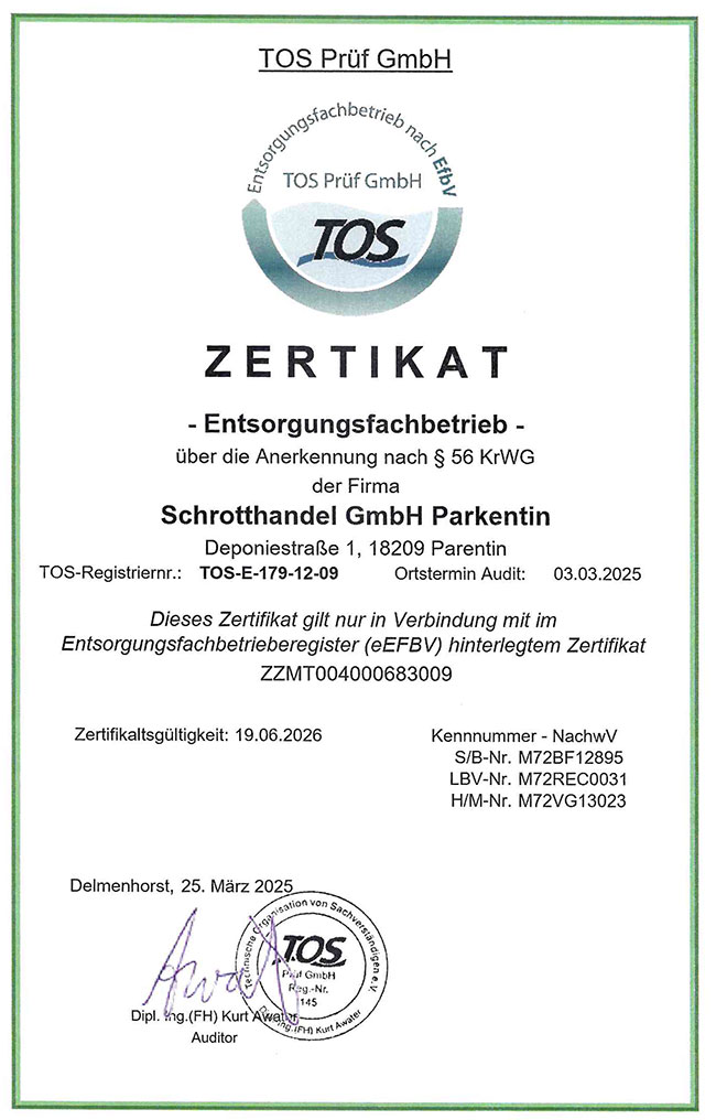 Seit dem 20.12.2012 ist unser Unternehmen ein Entsorgungsfachbetrieb über die Anerkennung nach §56 KrWG.